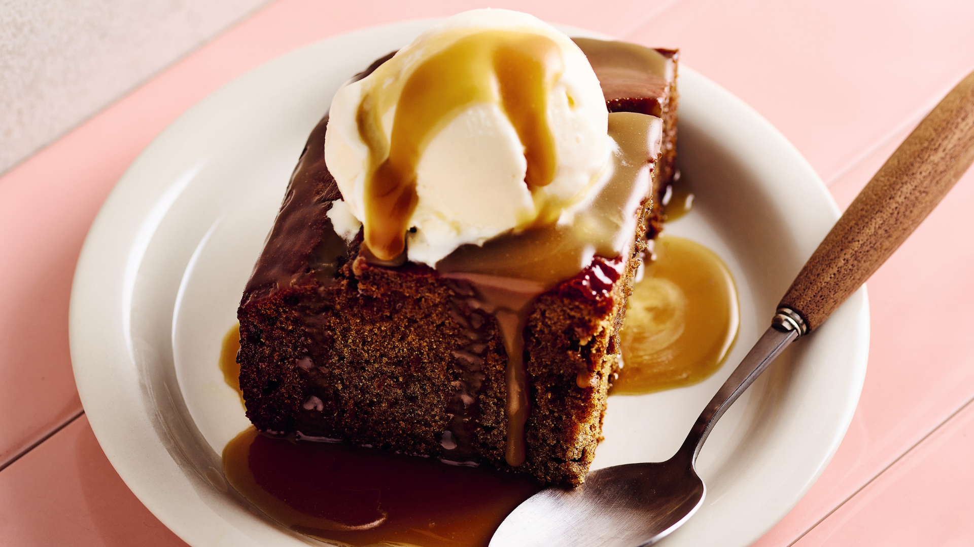 Meanwhile, to make the caramel sauce, melt the butter in a medium saucepan over medium heat. Add the sugar and cream and whisk until the mixture becomes smooth and glossy. Stab the top of the pudding all over with a skewer and pour half the caramel sauce over – it will sink into the holes and soak the cake. Serve the pudding with ice-cream, with the remaining sauce drizzled over the top.