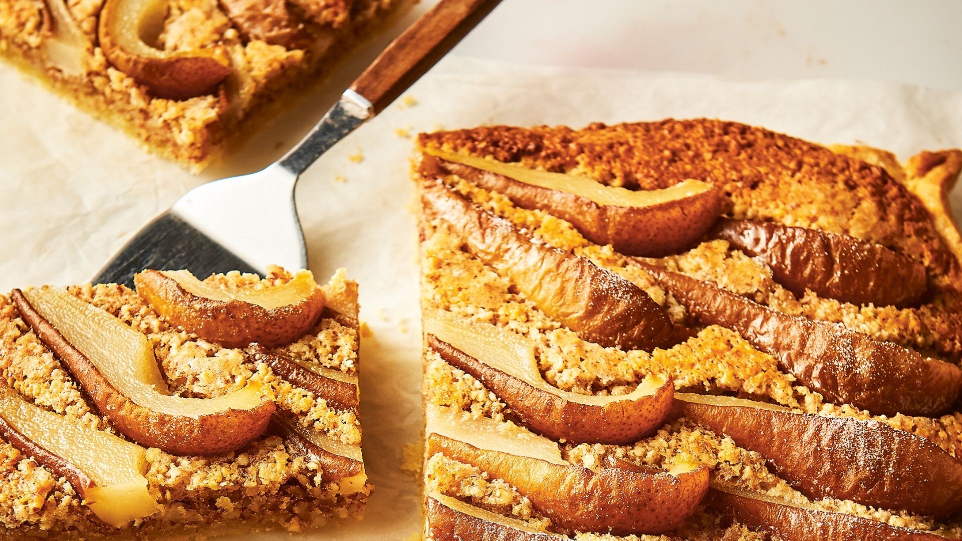 Juicy pear and rich almond frangipane make this slab tart elegant yet easy. The assembly is simple, but it looks impressive on the table.